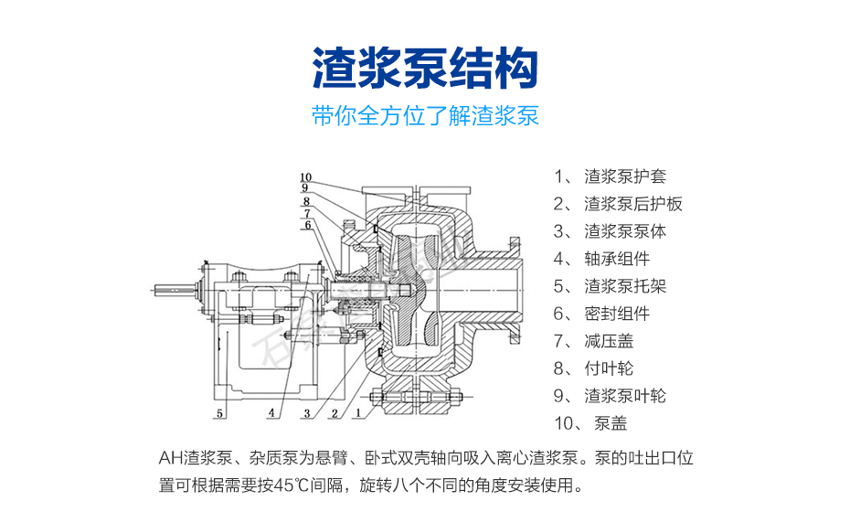 AHk1体育结构:AHk1体育、杂质泵为悬臂、卧式双壳轴向吸入离心k1体育。泵的吐出口位置可根据需要按45℃间隔,旋转八个不同的角度安装使用。